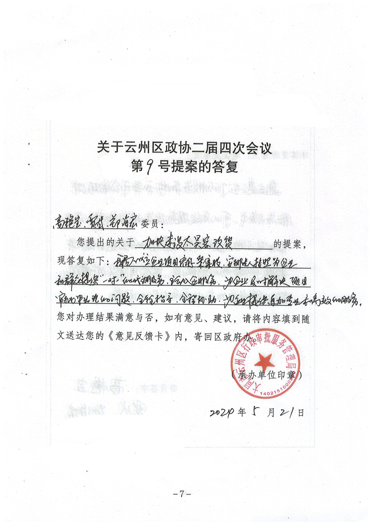 關于云州區政協二屆四次會議第9號提案的答復